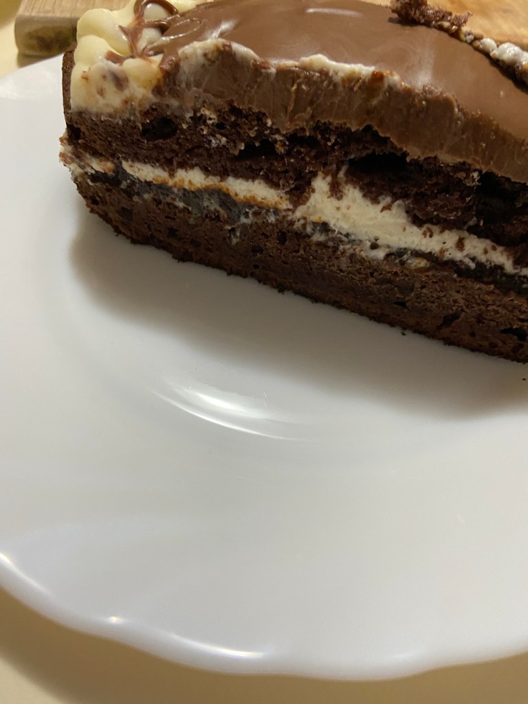 Turnăm ciocolata neagră, la temperatura camerei, peste spuma de ouă.