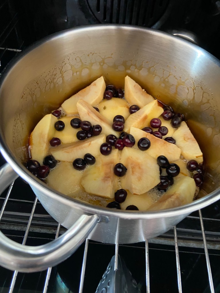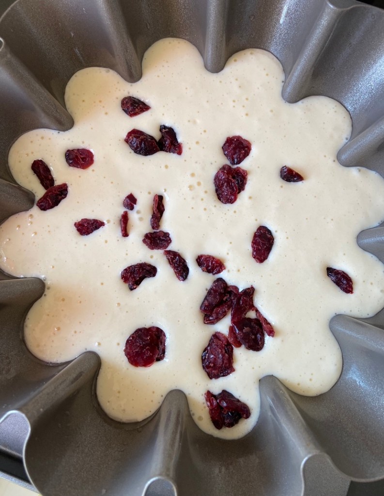 Turnăm în forma, adăugăm o mână de merișoare și dăm totul la cuptorul preîncălzit.