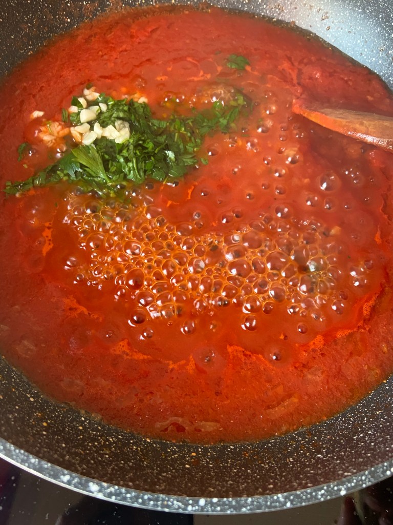 Punem într-o tigaie sucul de roșii cu uleiul și 100ml apă. Îl aducem la fierbere și apoi îl lăsăm, la foc mic, timp de 10 minute, să scadă.