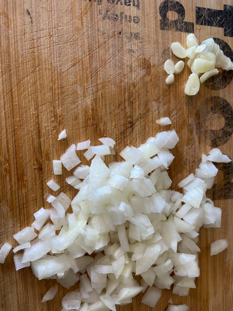 Tocăm mărunt usturoiul și ceapa.