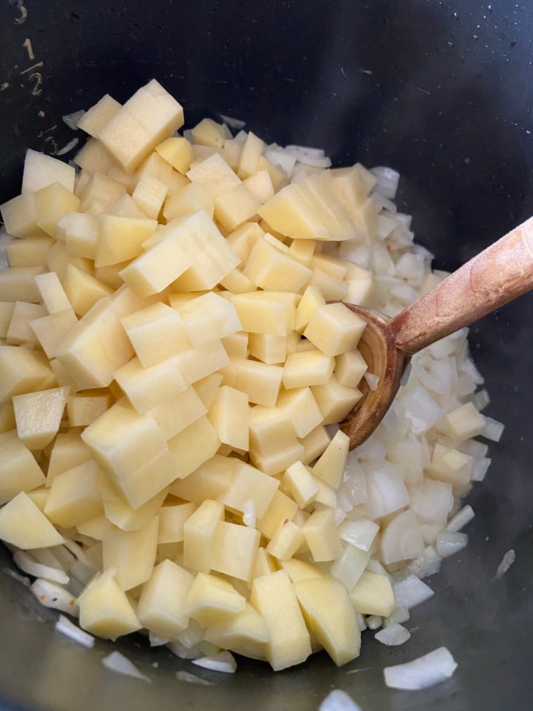Curățăm cartoful și îl tocăm bucățele. Îl punem și pe el la rumenit cu ceapa.