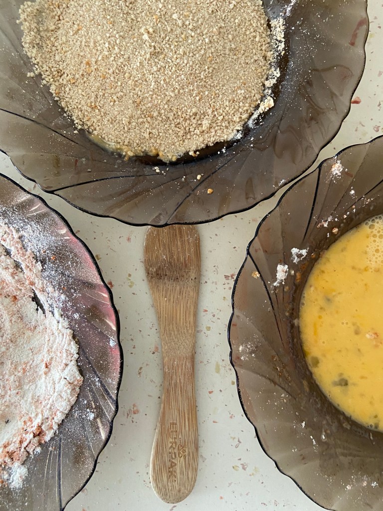 Pregătim 3 farfurii: una cu făină și condimente, una cu ouăle bătute bine, una cu pesmet.