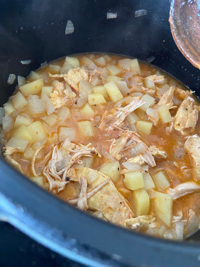 După ce a prins și cartoful o culoare galbenă, frumoasă, adăugăm sosul de la carnea de pui și carnea mărunțită.