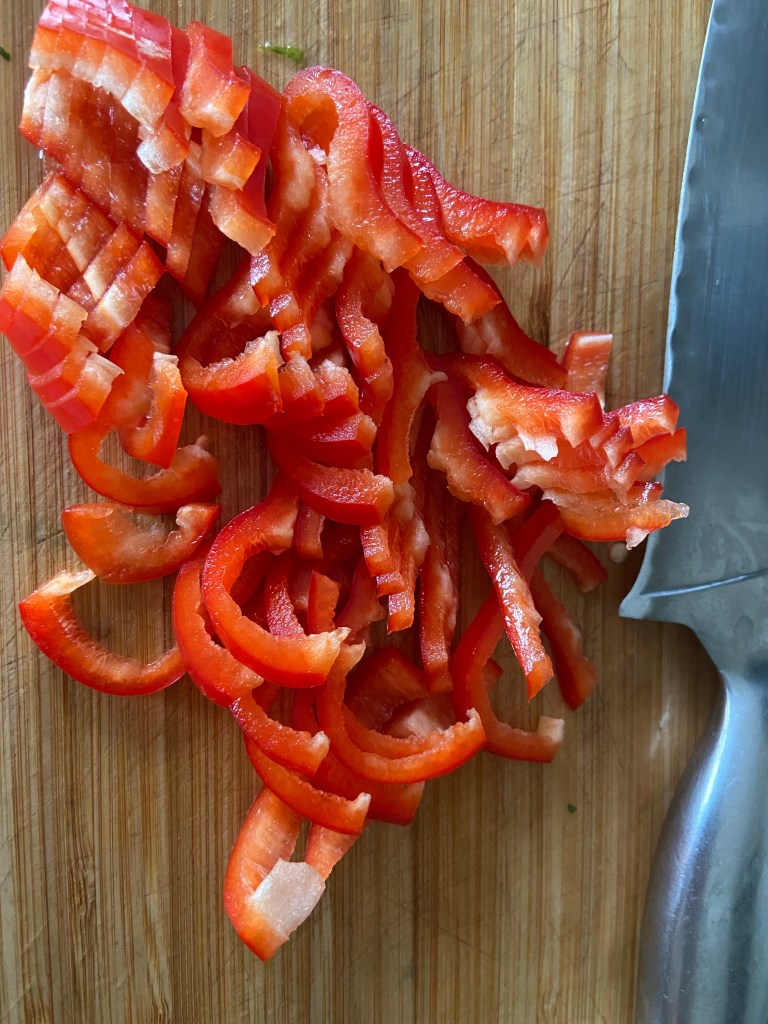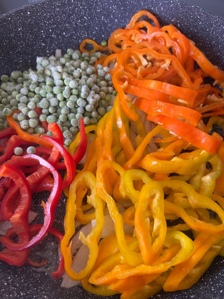 Tocăm felii subțirele ardeiul și îl punem și pe el în tigaie, alături de o mână de mazăre.
