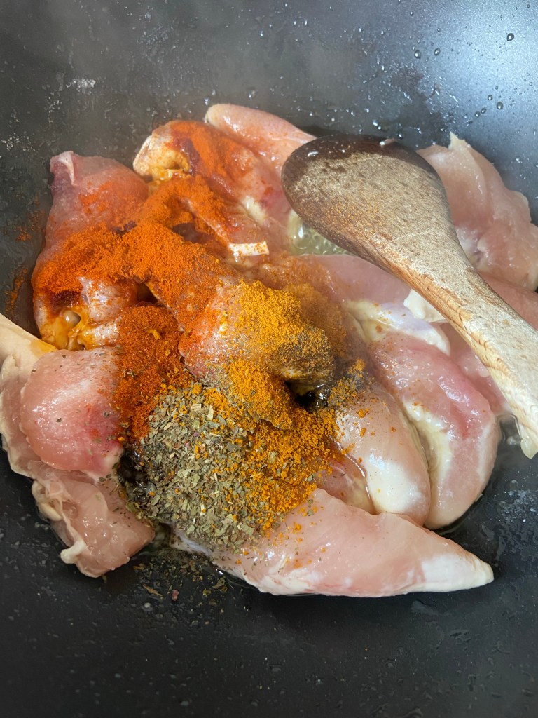 În wok, am pus puțin ulei de măsline și pieptul de pui. Îl asezonăm cu sare, piper, busuioc, chilli, boia de ardei dulce, un praf mic de curry, amestcăm bine și îl rumenim bine pe toate părțile.