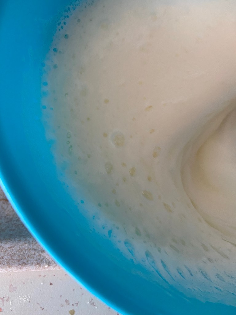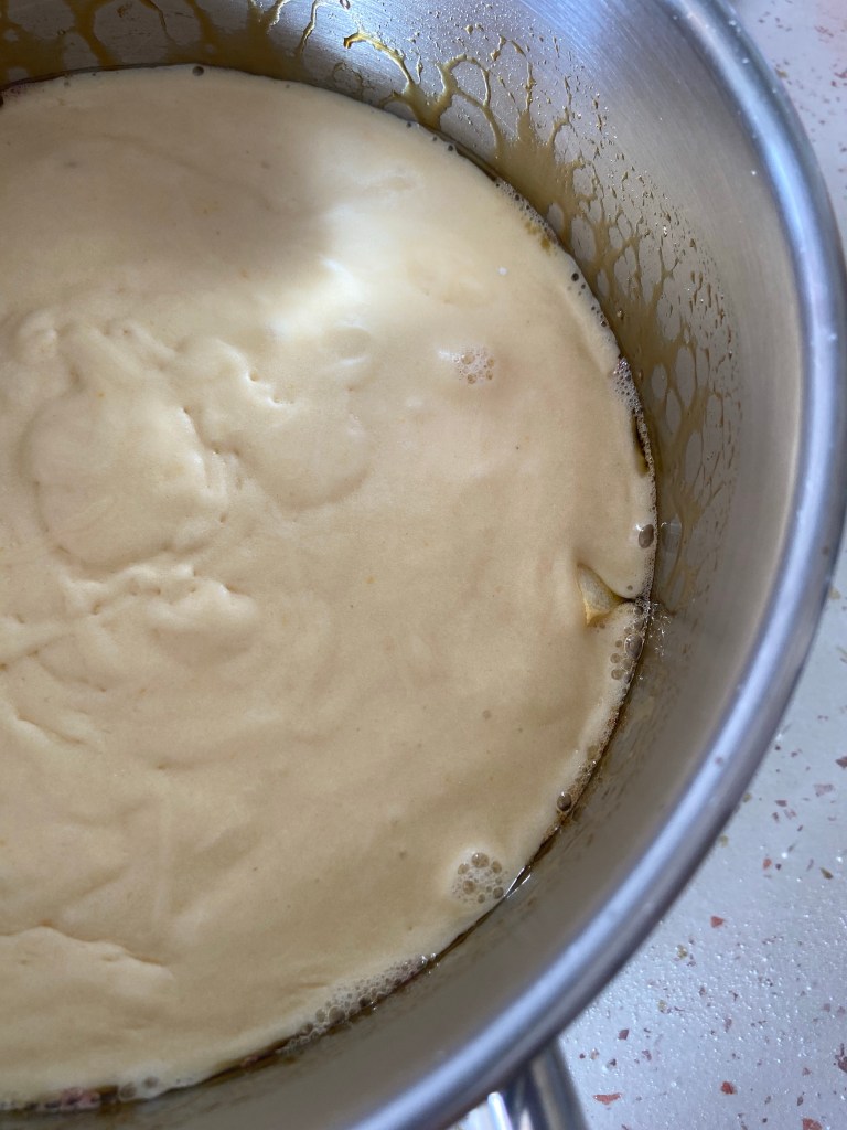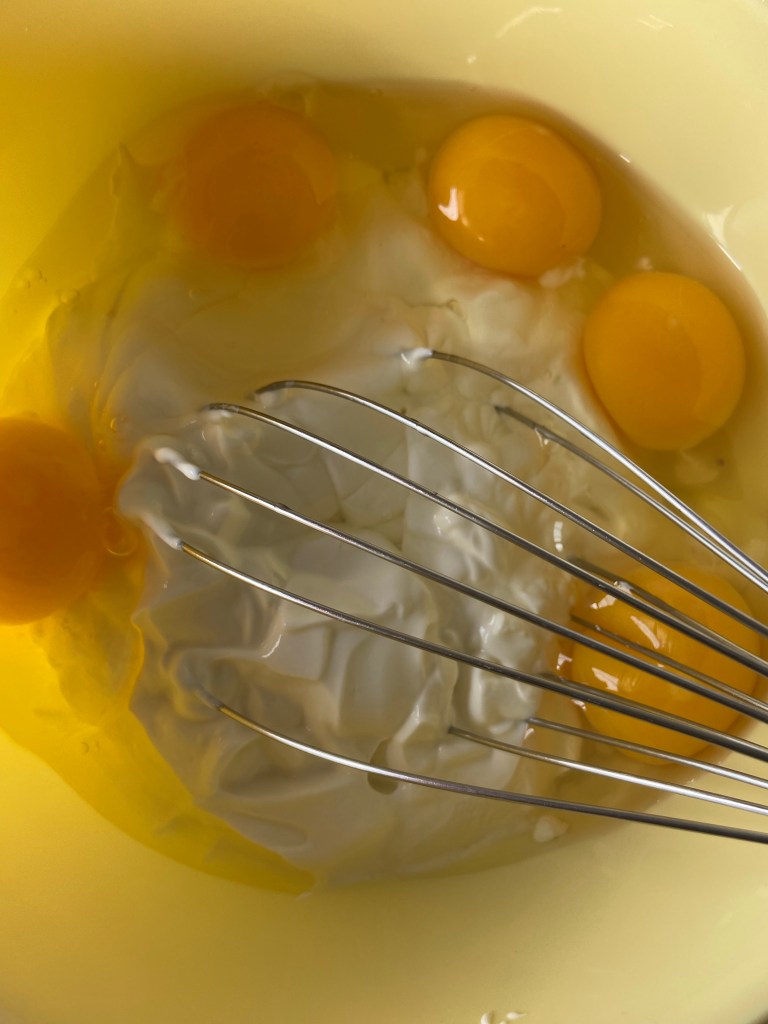Mixăm la viteză mare ouăle cu zahărul, pâna ce se omogenizează. adăugăm iaurtul grecesc și îl încorporăm.