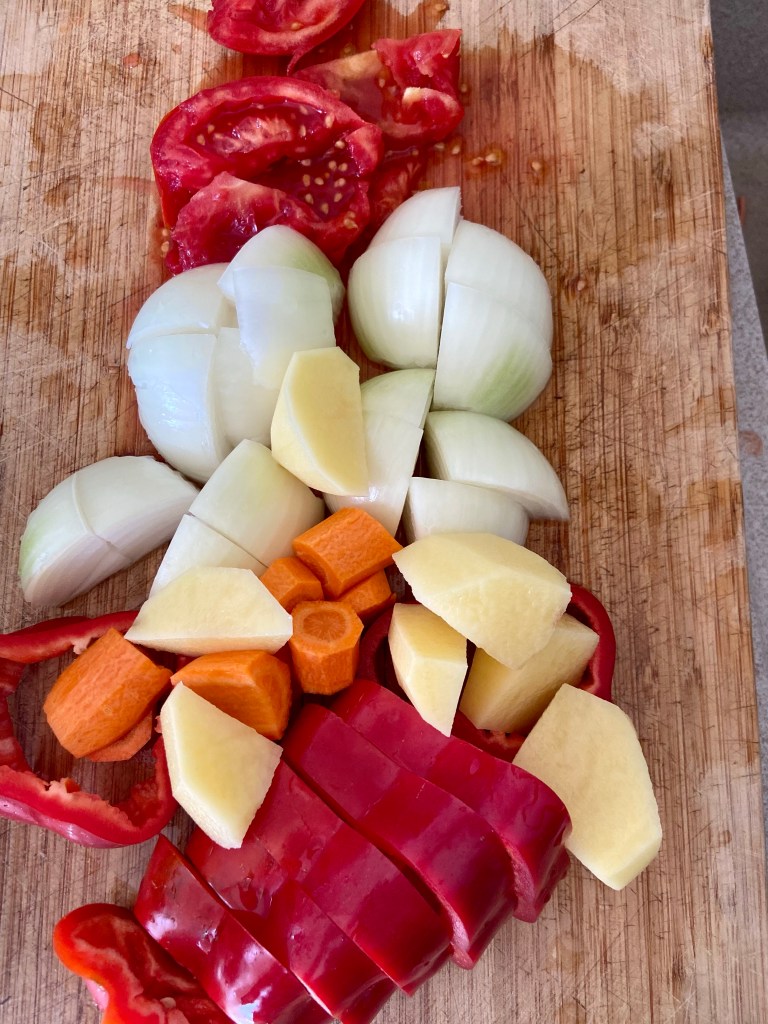 Tocăm roșiile și ardeiul kapia cuburi și le punem la final.