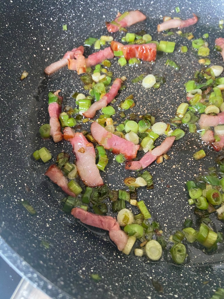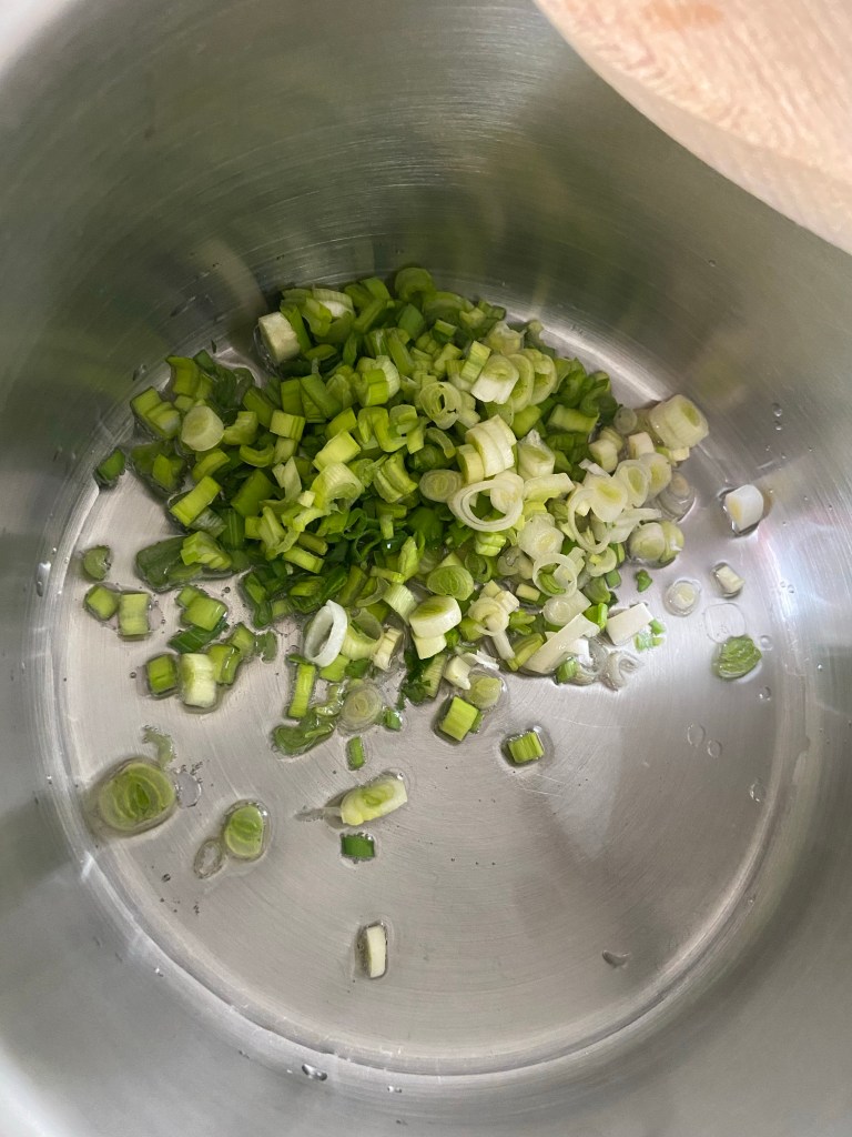 Spălăm bine lintea și o lăsăm în apă rece până ce terminăm de pregătit restul legumelor. Tocăm ceapa verde și o punem la rumenit în 3 linguri de ulei.