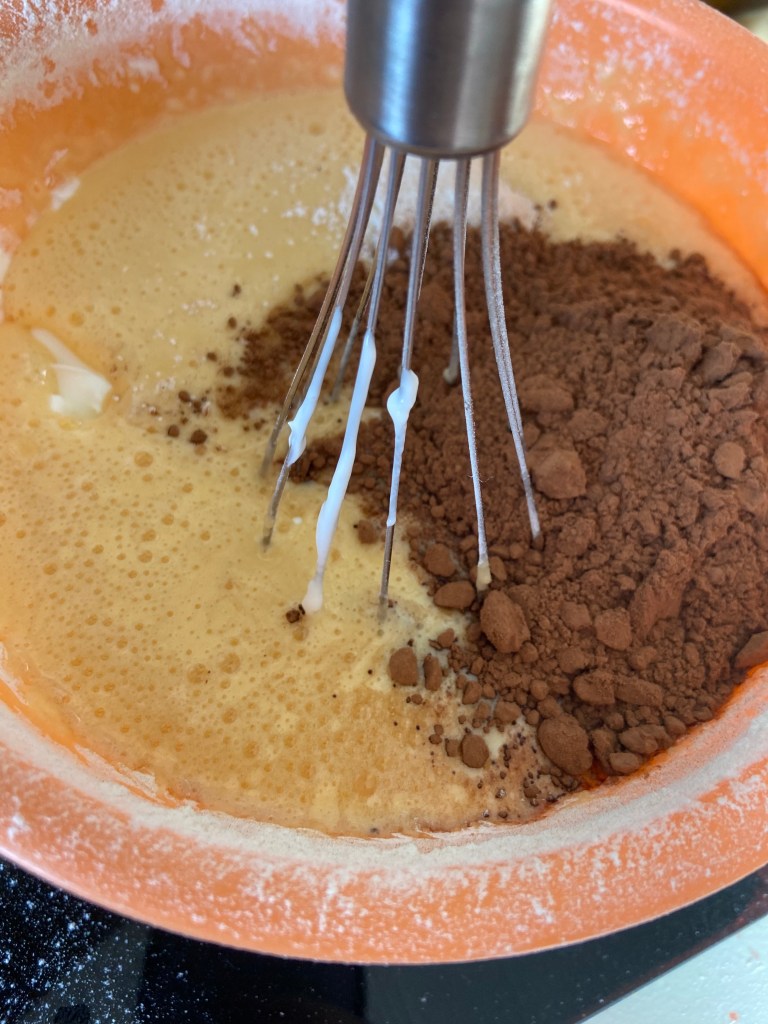 Adăugăm zahărul și amestecăm bine. În ploaie, punem cele 2 linguri de amidon și amestcăm energic ca să nu avem cocoloașe.