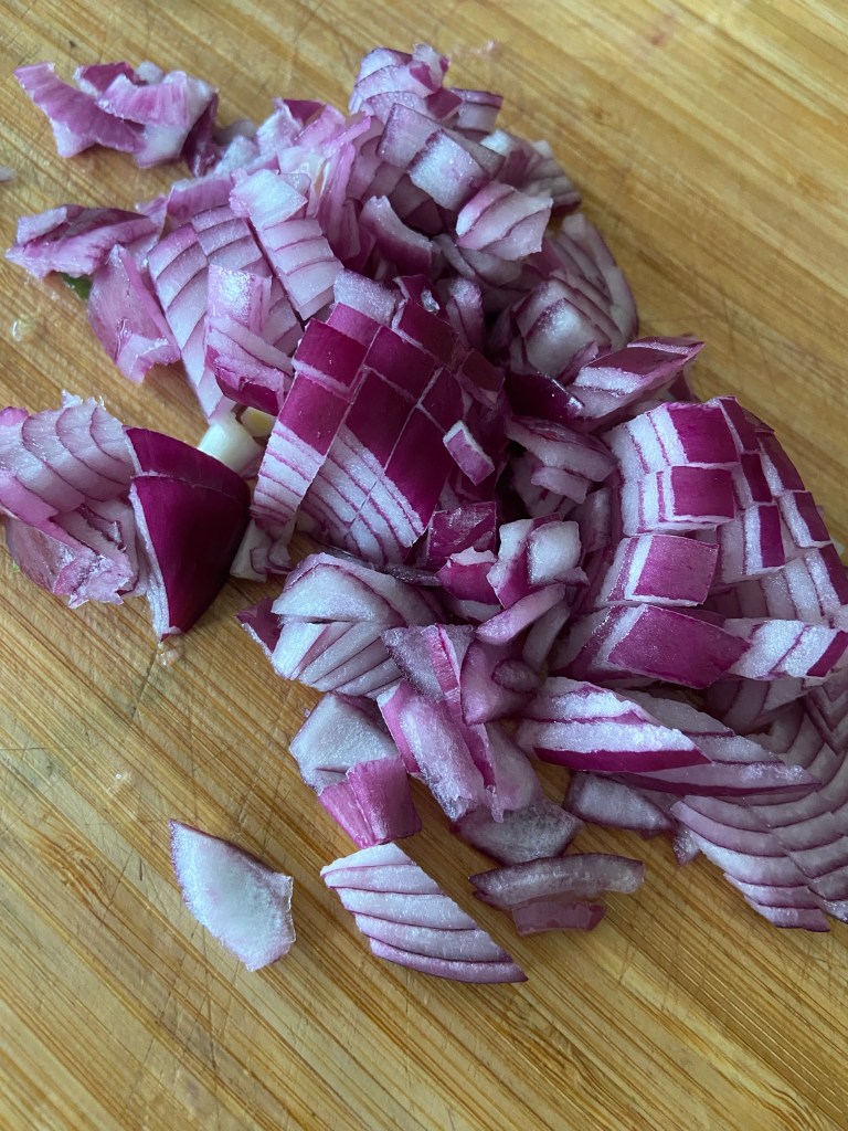 Curățăm și tocăm cubulețe potrivite ceapa roșie.