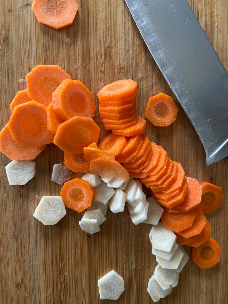 Curățăm și tocăm felii subțiri morcovul și rădăcina de pătrunjel.