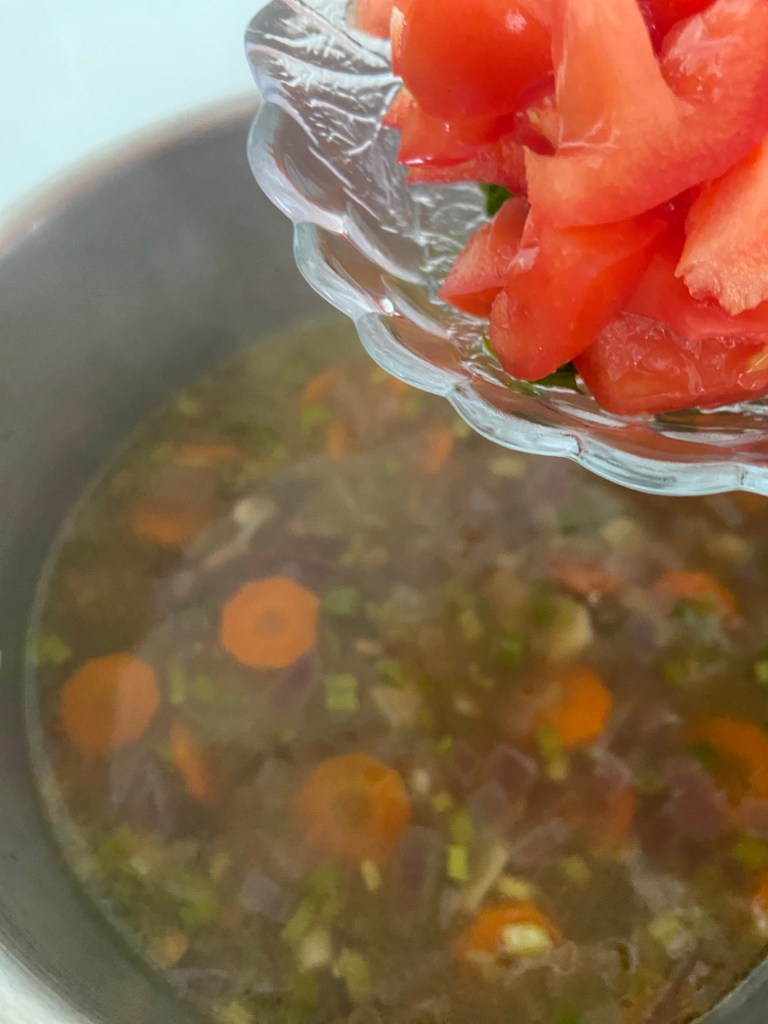 Spălăm și tocăm o roșie și o punem peste restul legumelor.
