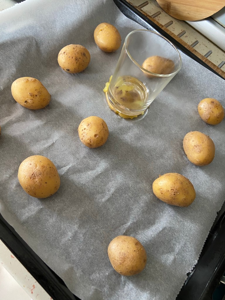 Așezăm cartofii în tavă și îi zdrobim cu un pahar cu fundul gros.