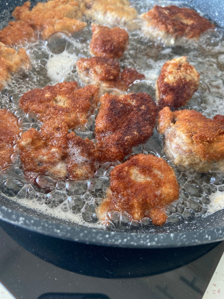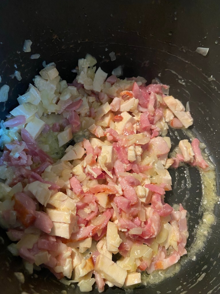 După ce ceapa s-a caramelizat și o simțim că este moale, adăugăm feliile de piept de pui.