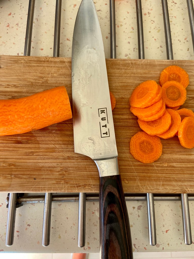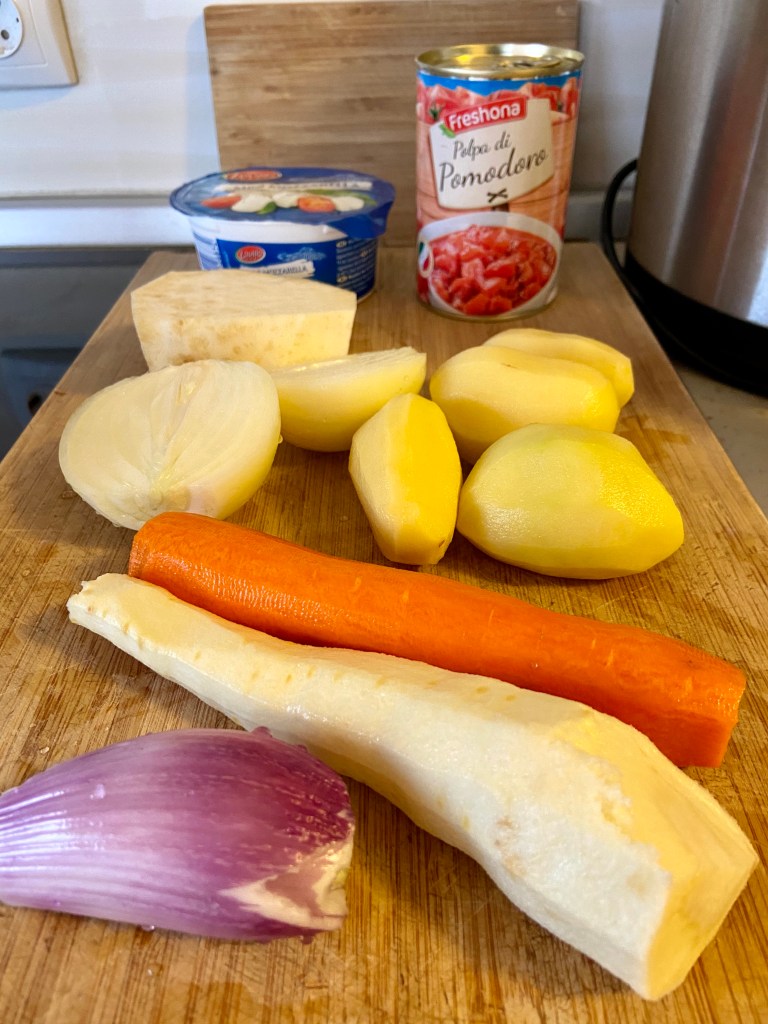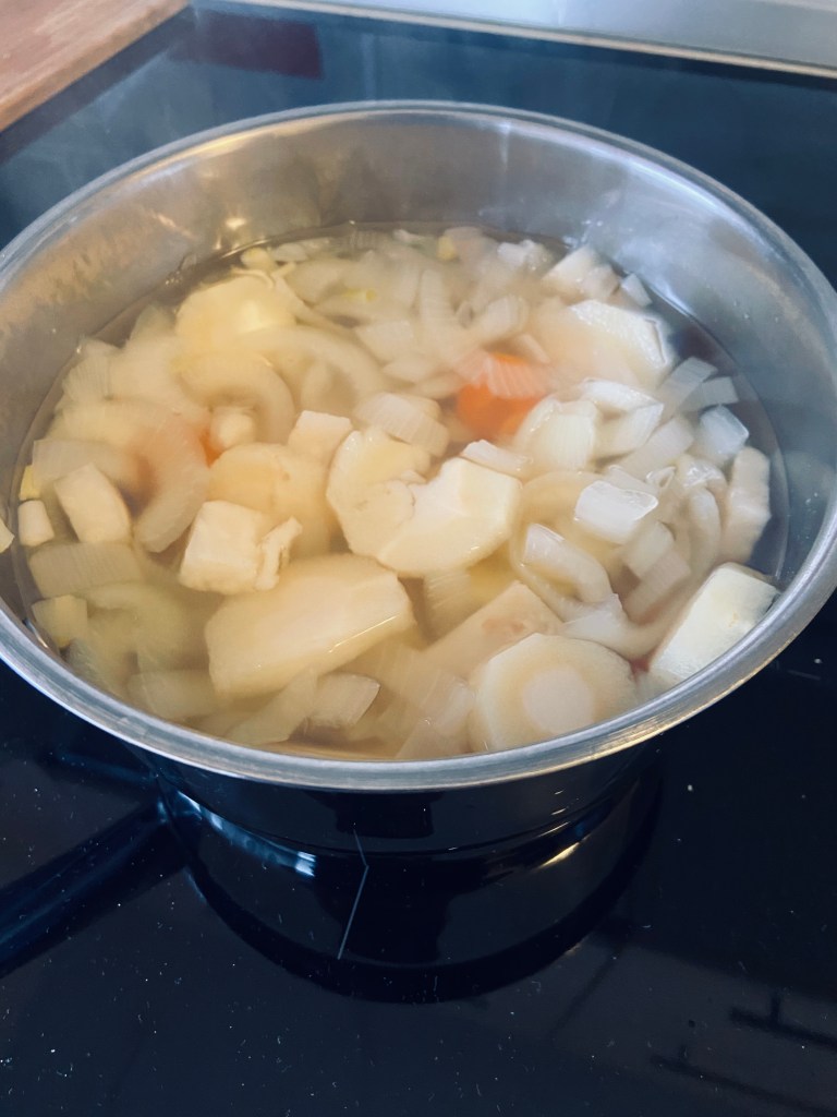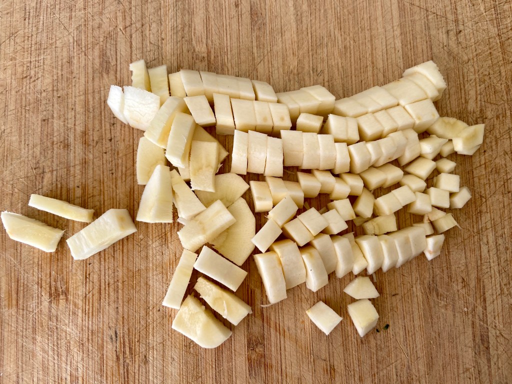 După, m-am ocupat de păstârnac, pe care l-am tocat grosier. Păstârnacul este o sursă importantă de fibre. Este înrudit direct cu morcovul, așa că timpii de gătire sunt asemănători.
