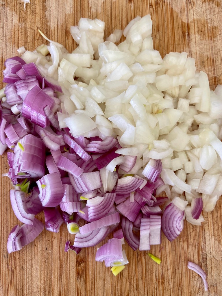Am lăsat ceapa la final din motive ce țin doar de plâns. Eu am ales să o toc cubulețe, nici prea mari, nici prea mici.
