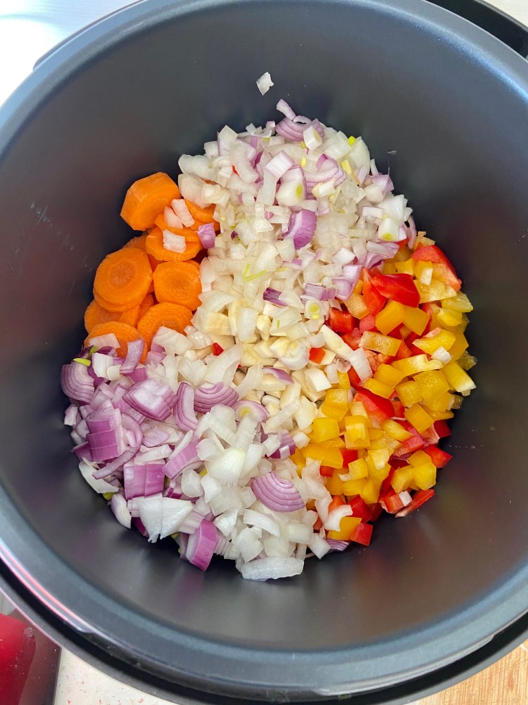 Am pornit aparatul Crock-Pot Express. Am ales modul Beans, timp de gătire 2 ore. După ce am clătit fasolica, am adăugat-o în oală, împreună cu toate legumele tocate anterior.
