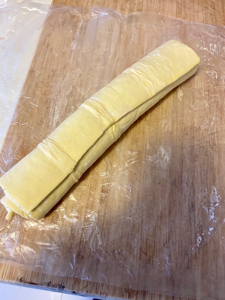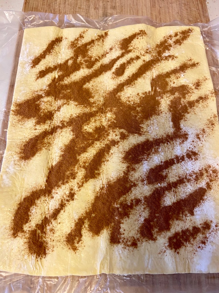 Este mai bine ca aluatul să fie decongelat complet. Se mânuiește mai ușor, nu se rupe, poate fi întins. Îl desfacem ușurel și îl întindem pe o suprafață plană, apoi punem scorțișoara în ploaie peste aluat.