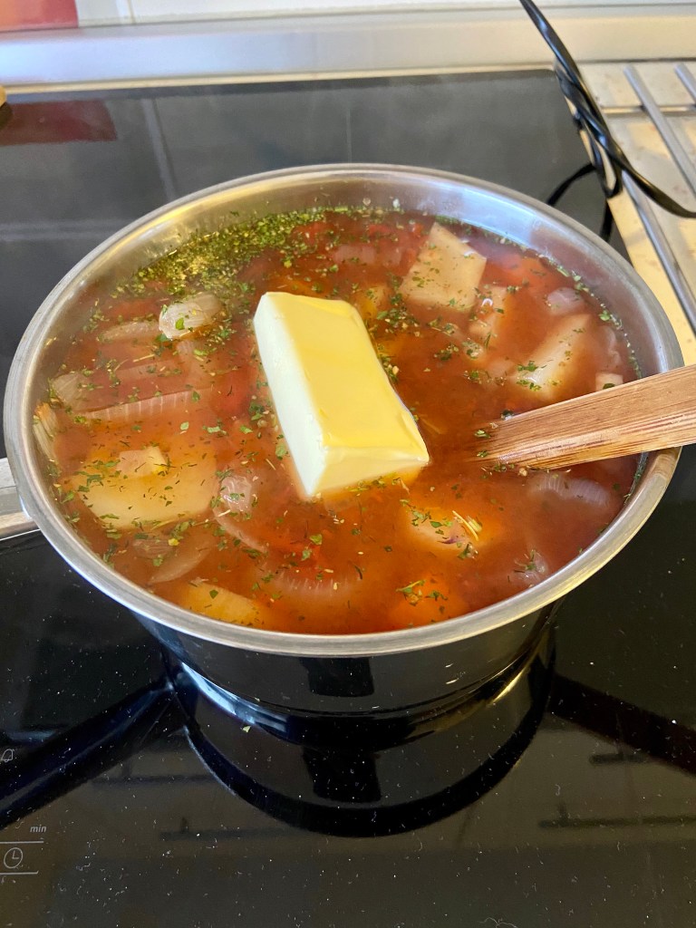 După ce am lăsat la foc mic să fiarbă un pic și roșiile adăugăm un cub generos de unt, cam 100g. Micii Mofturoși au nevoie de calorii multe ca să crească mari și să se joace toată ziua. Dacă doriți o variantă light, înlocuiți untul cu ulei de măsline.