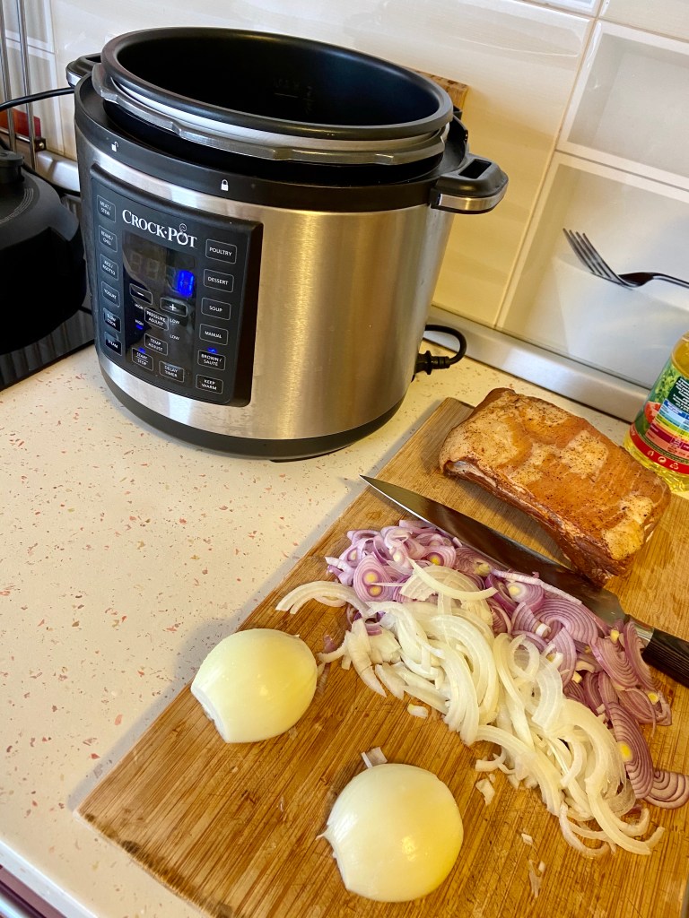 Pornim Crock-Pot-ul și selectăm funcția Brown/Saute, 20′. Cât timp aparatul se încălzește, noi tocăm ceapa. Eu am ales să o toc julien / fideluță / solzișori.