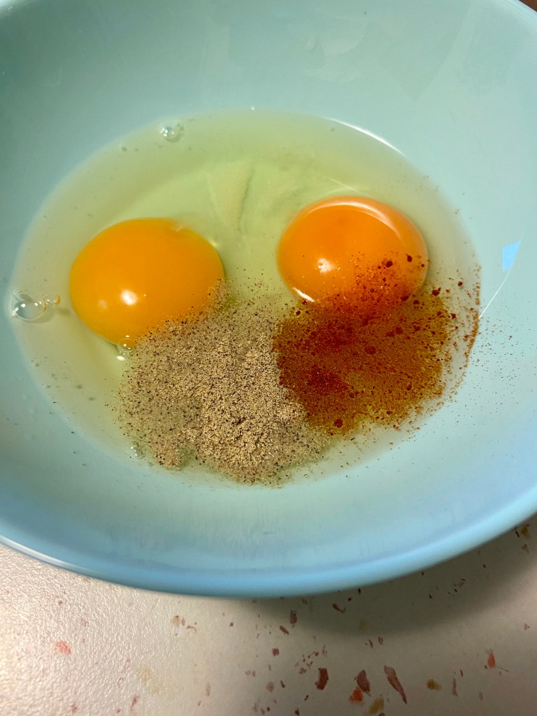 Batem bine două ouă cu un praf de sare, unul de piper alb și un praf de chilli.