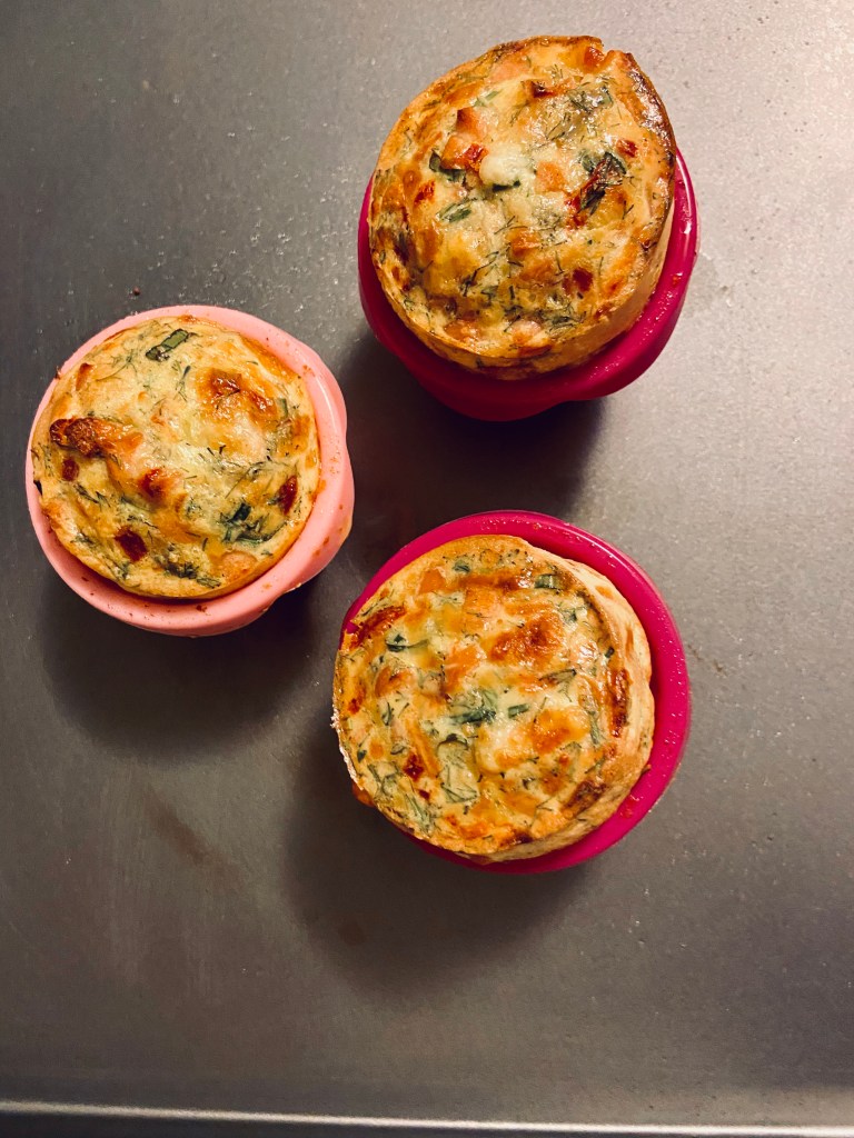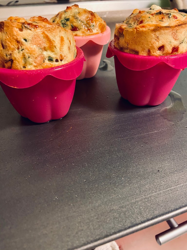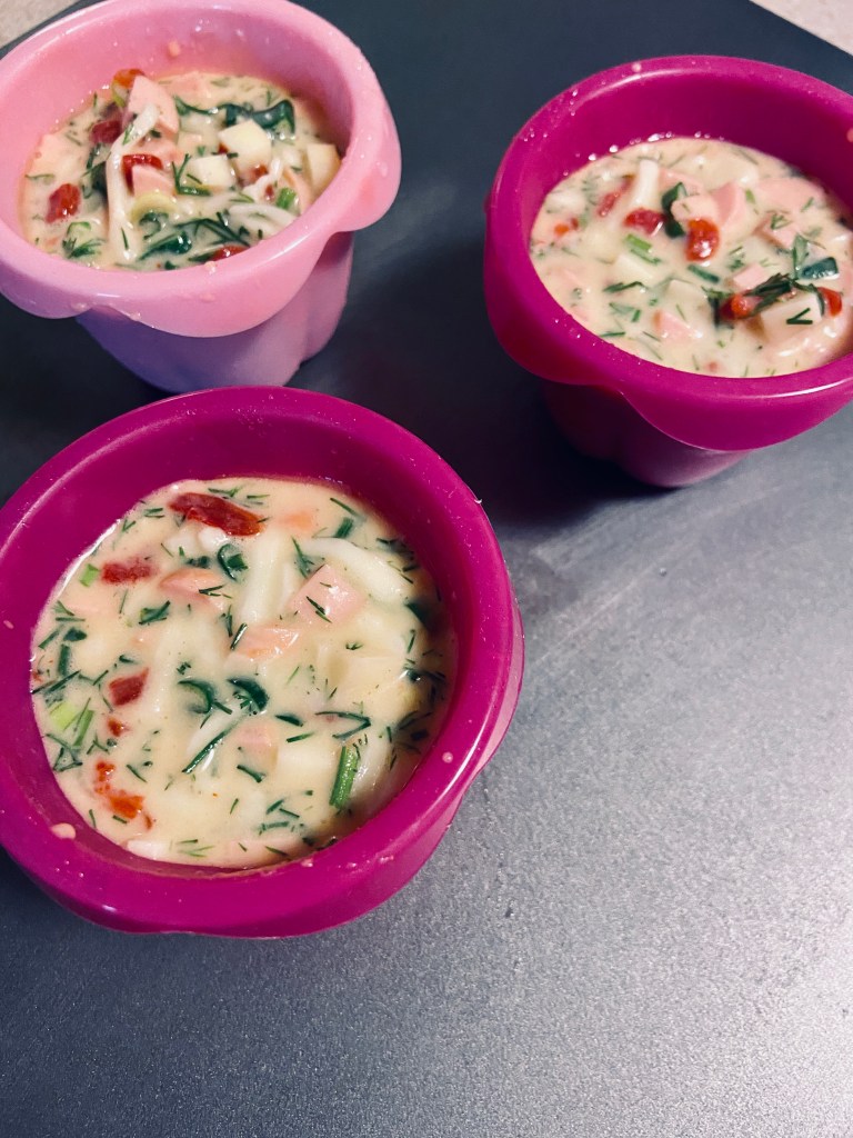 Am tocat mărunt: o legătura de mărar, un fir de ceapă verde, un ardei kapia copt, o jumătate felie cașcaval afumat și un crenwurștel. Și am pus și o mână de mozzarella. Le amestecăm cu ouăle bătute bine și cu 2 linguri rase de făină. Pregătim 3 forme de silicon pentru brioșe.