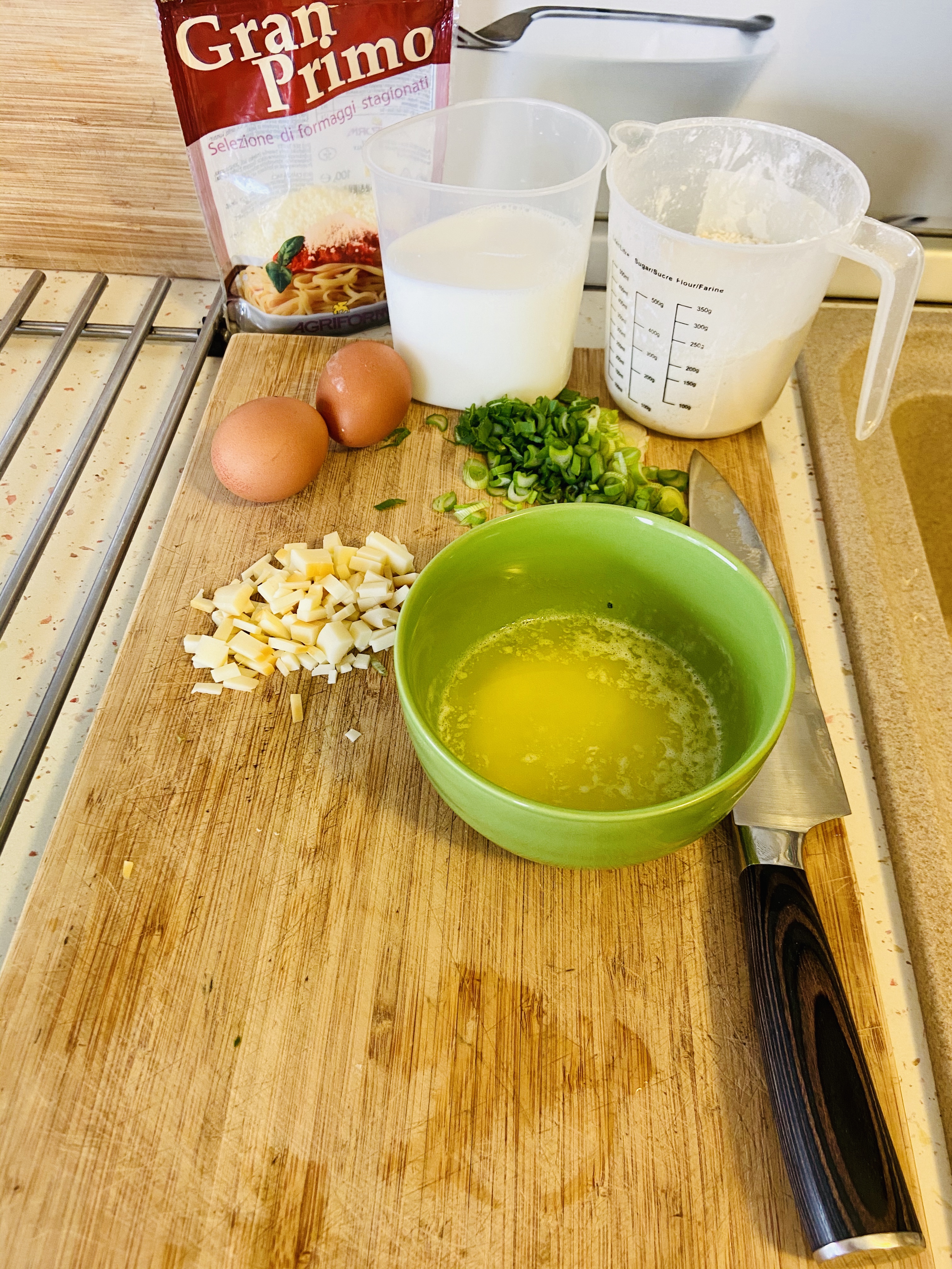 Ce avem nevoie? Ouă, făină, cașcaval, parmezan, lapte, ceapă verde, unt și praf de copt.