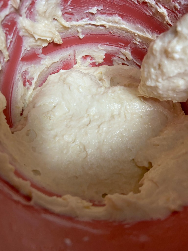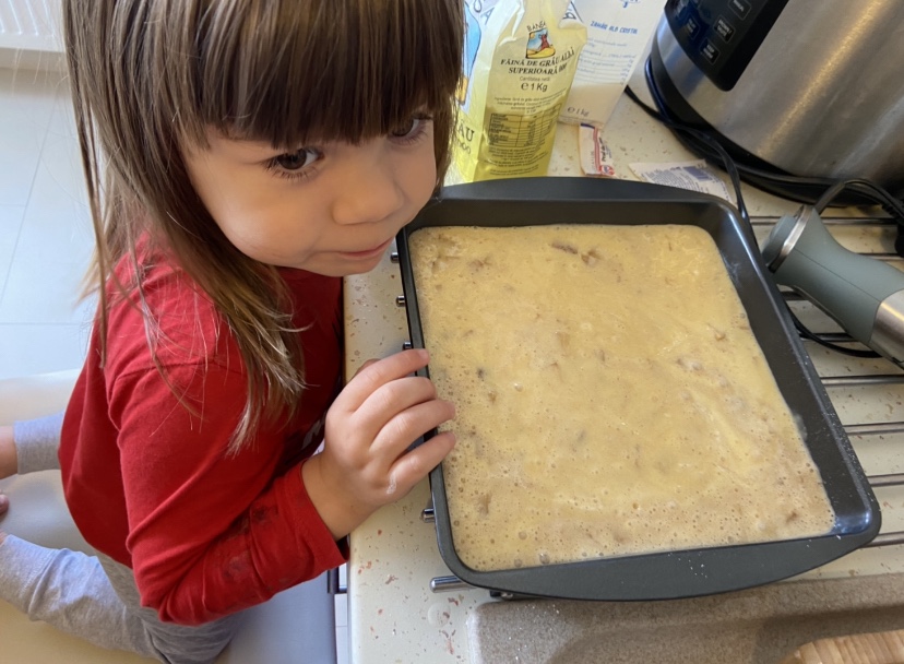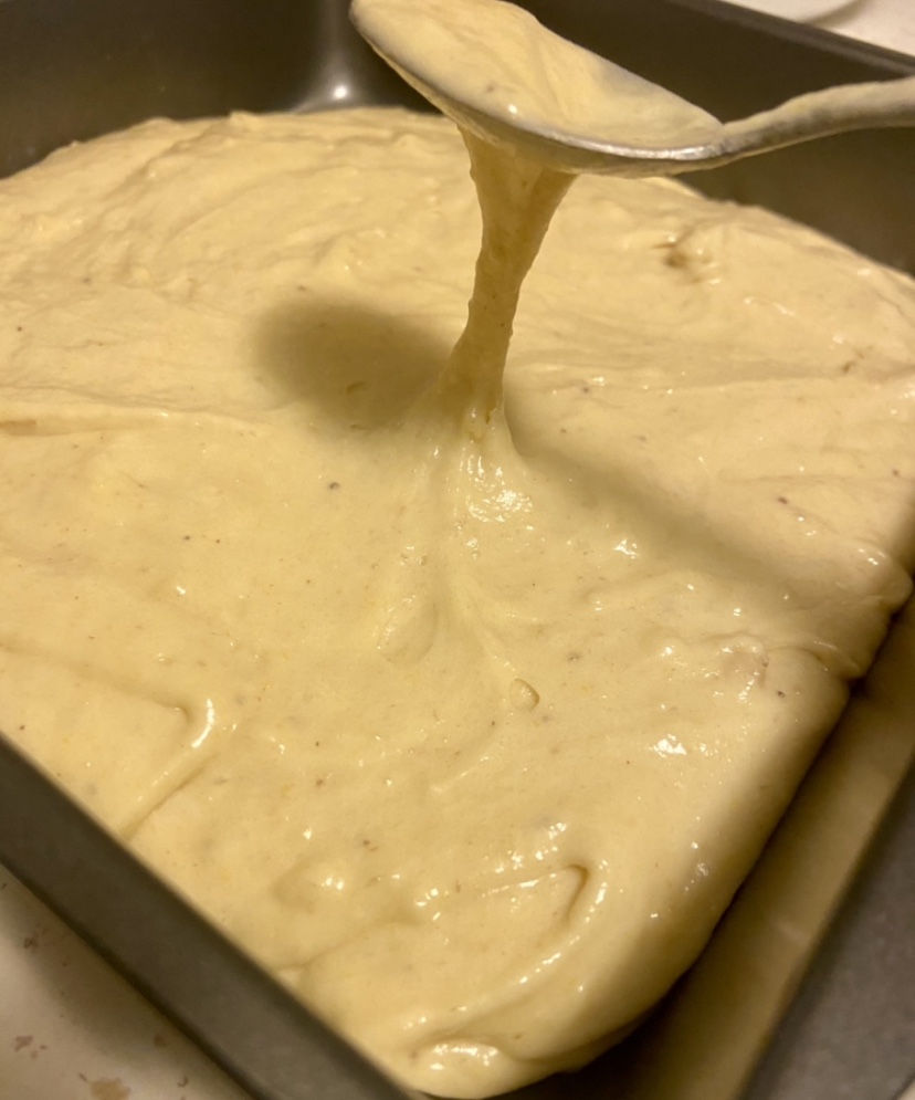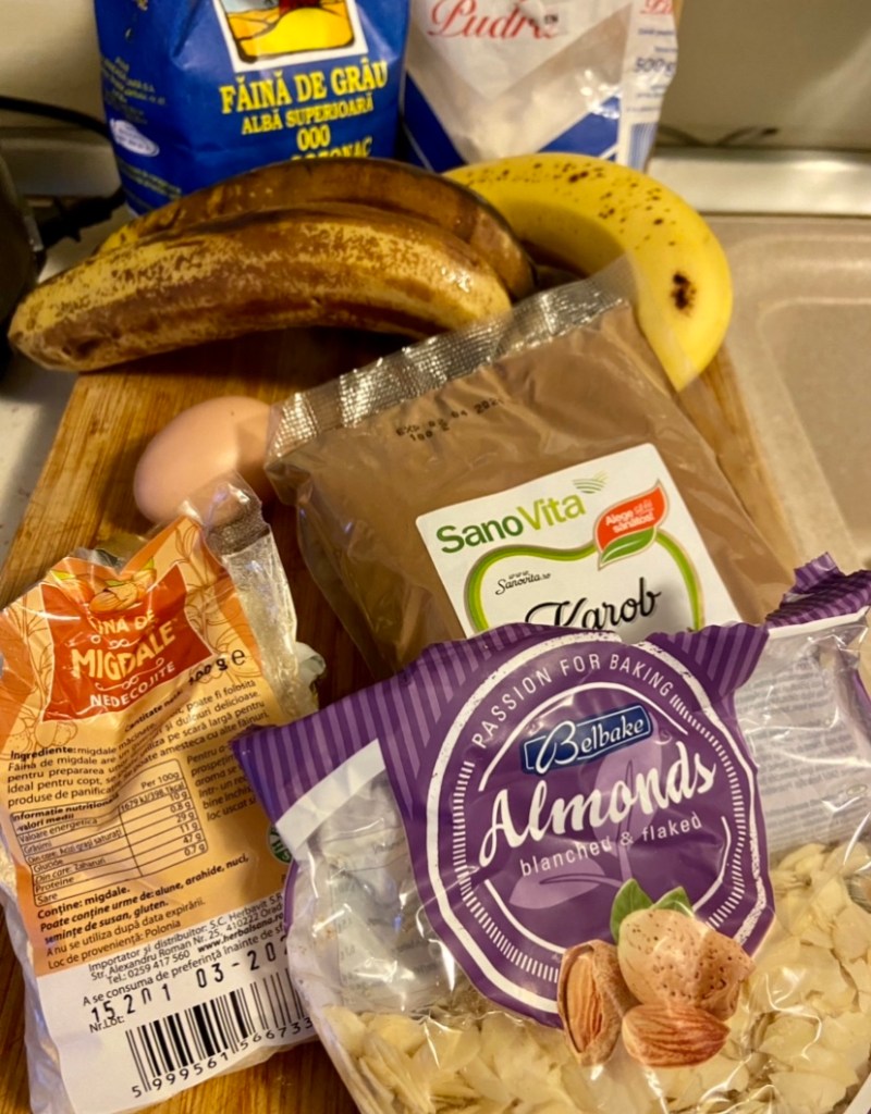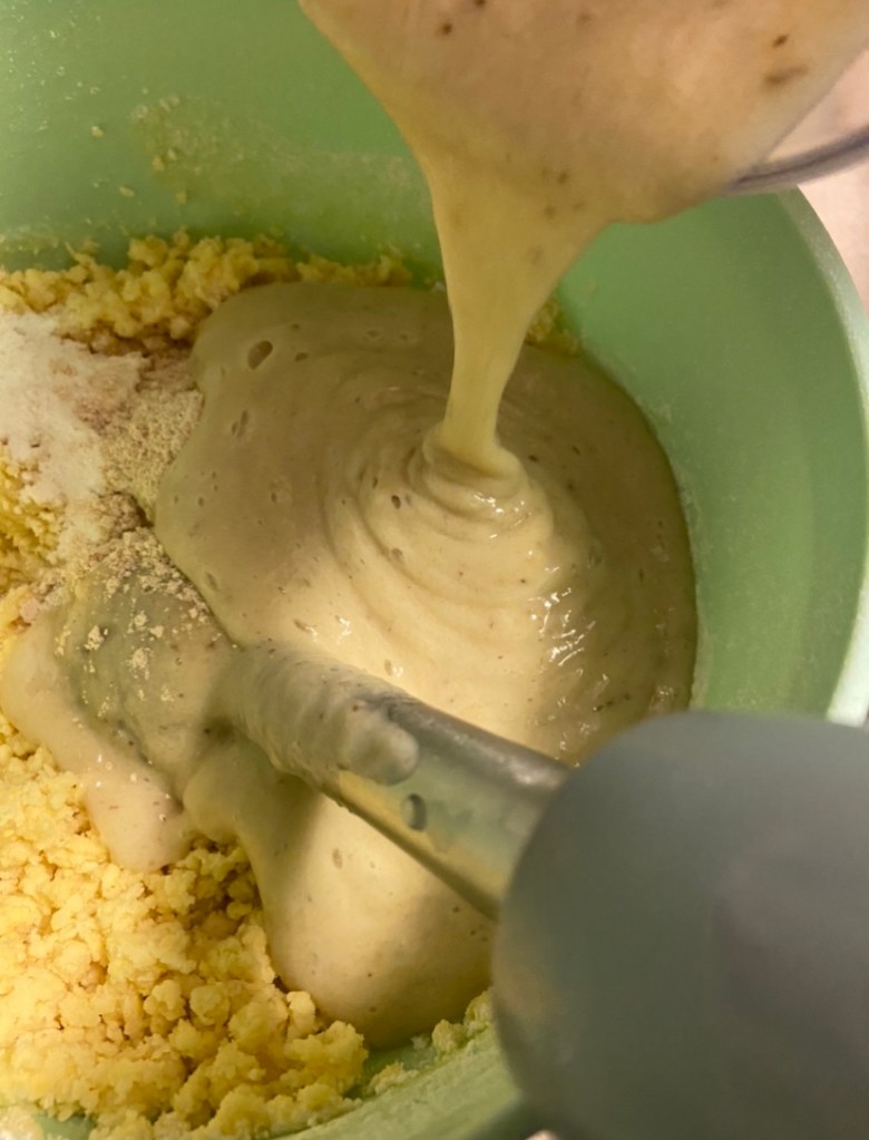 Urmează făina – punem toate cele 16 linguri de făină și praful de copt. După ce devine dificil de mixat, adăugăm 150ml lapte.