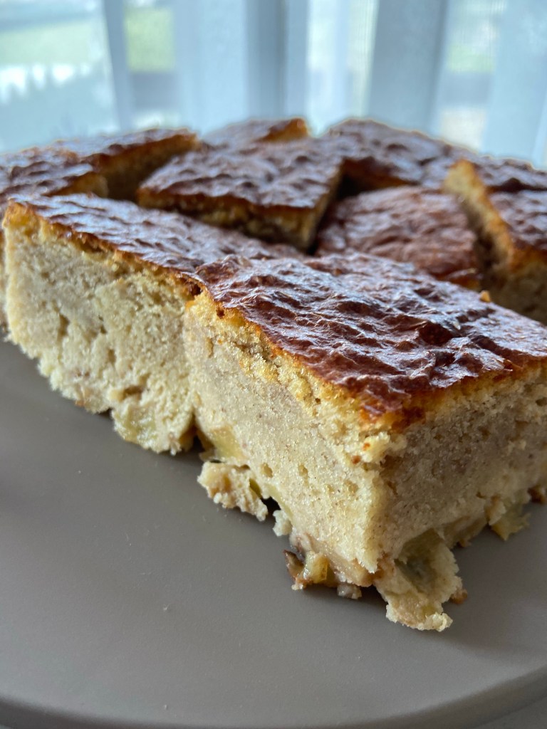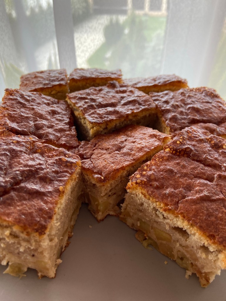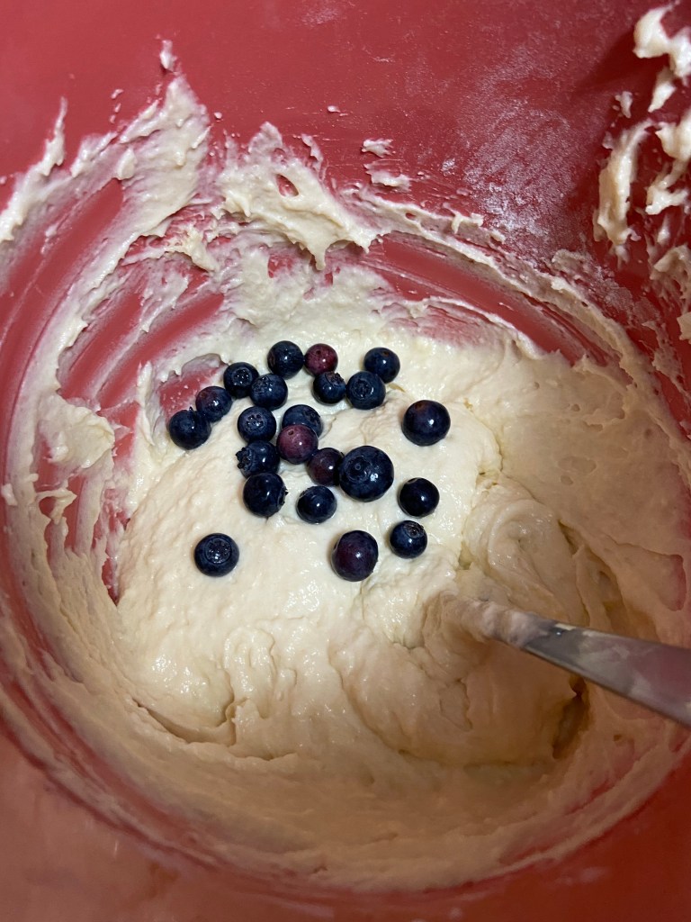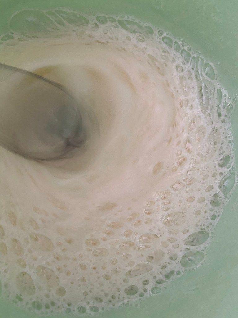 Urmează făina – punem toate cele 16 linguri de făină și praful de copt. După ce devine dificil de mixat, adăugăm 150ml lapte.