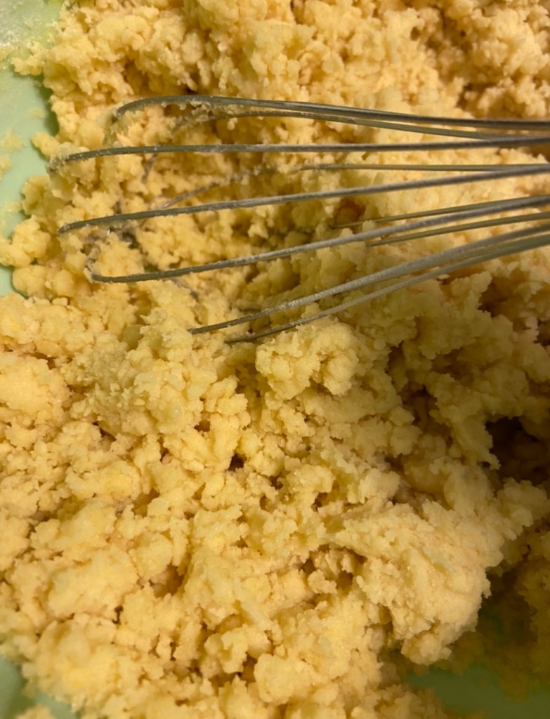 adăugăm cele 2 ouă întregi și cele 4 linguri de zahăr. Mixăm totul bine timp de 1 minut, cât untul se topește la cuptorul cu microunde.