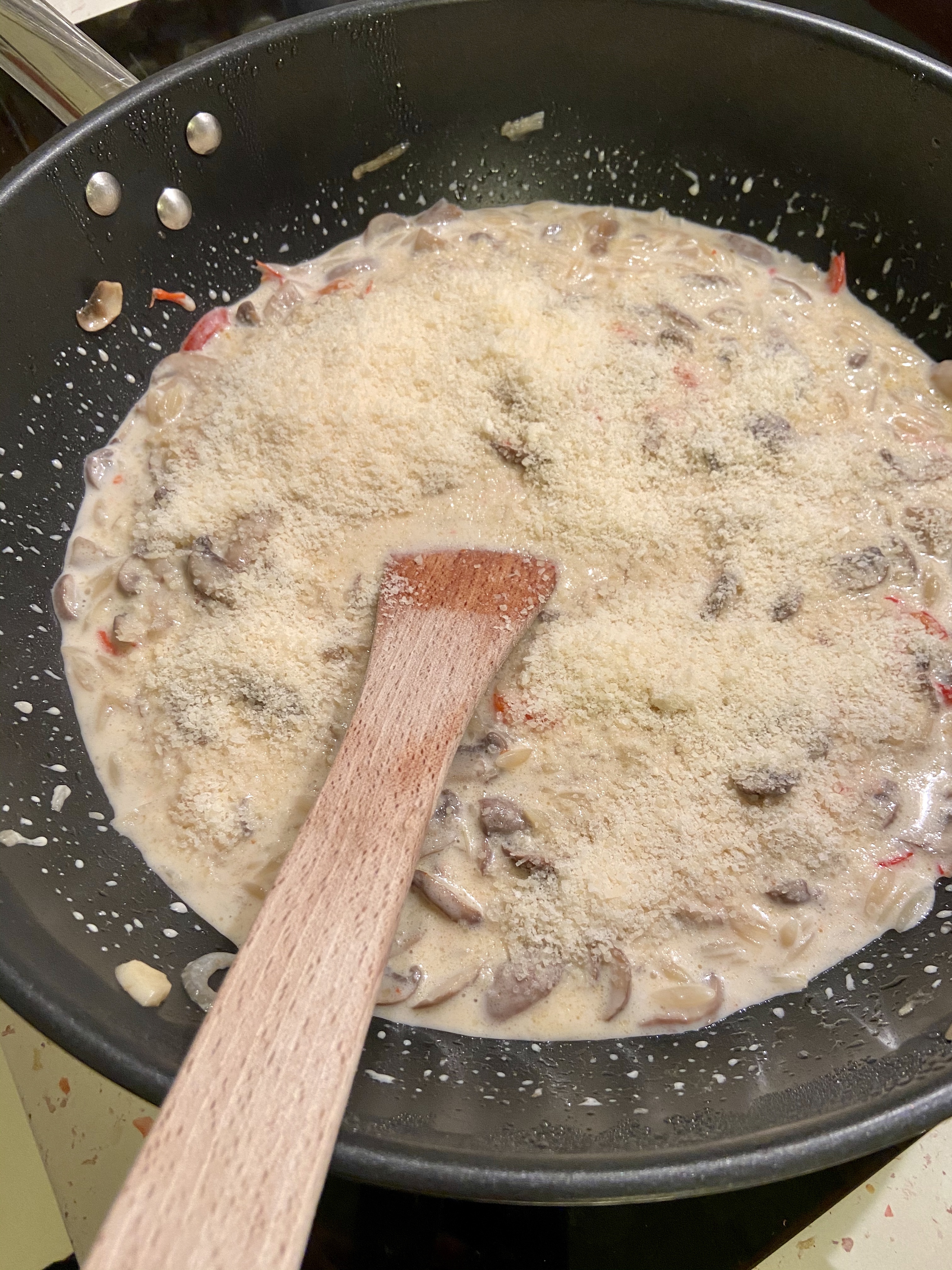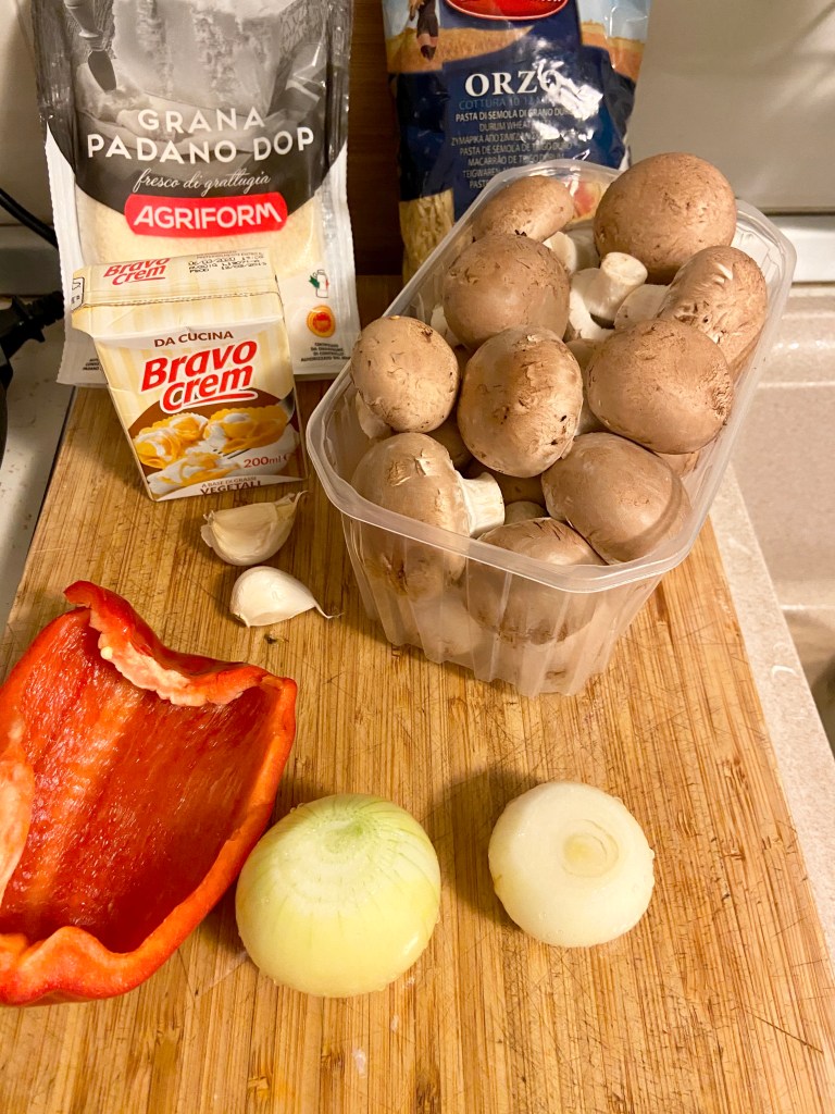 Paste orzo cu ciuperci, ardei gras și ceapă verdePaste orzo cu ciuperci și parmezan