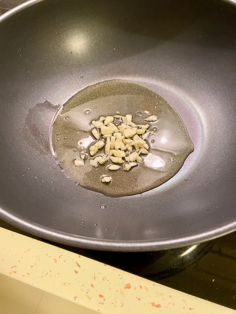 Punem în tigaie o lingură generoasă de ulei (eu am folosit de măsline, dar merge le fel de bine cel de floarea soarelui). Setăm focul să fie mediu și tocăm rapid usturoiul și îl punem la călit.