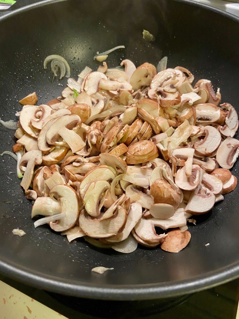 Ne apucăm să tocăm feliuțe subțiri ciupercile. Le aruncăm și pe ele în tigaie și le amestecăm ușor.