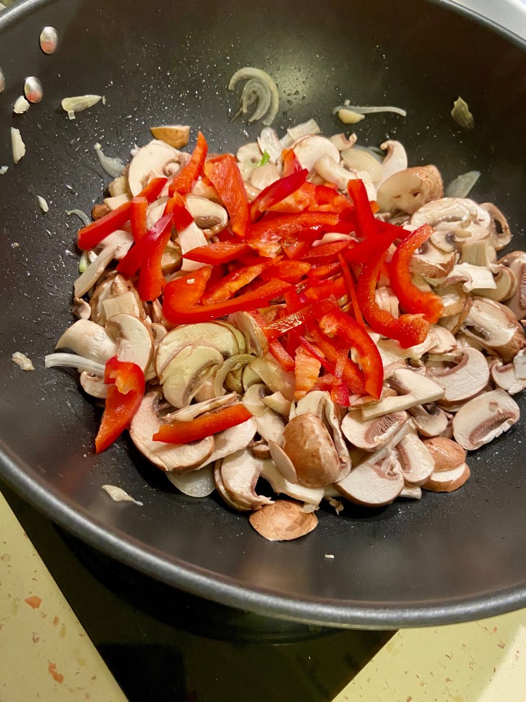 Tocăm repejor și ardeiul gras, și îl adăugăm peste ciuperci, în tigaie.