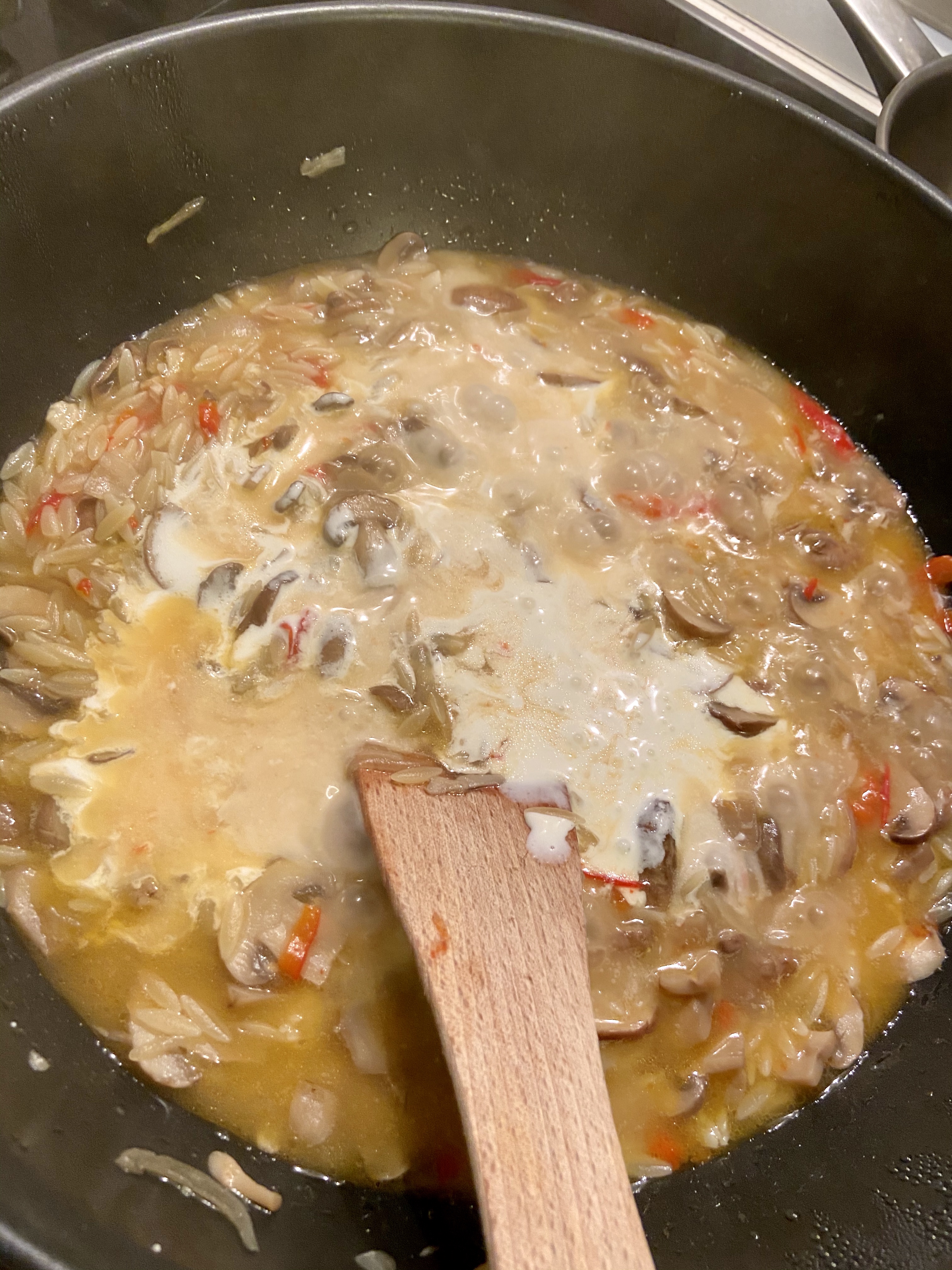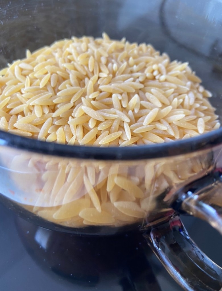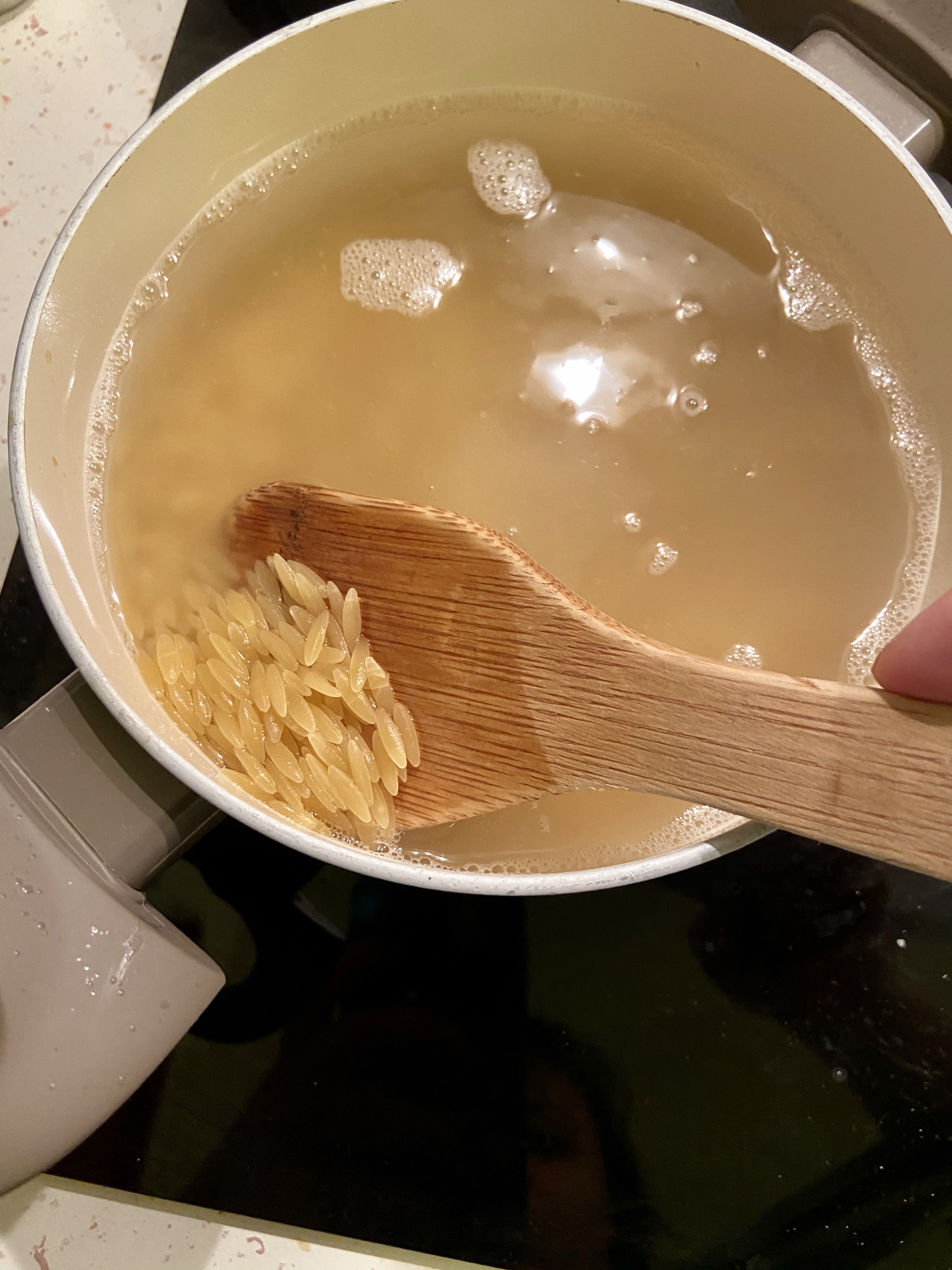 În acest timp, punem apa la fiert, pentru paste. Când apa clocotește, aruncăm pastele orzo și le fierbem 10/12 minute.