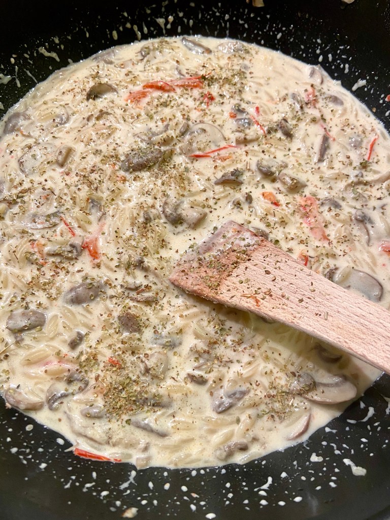 Eu am pus un praf de oregano, la final, însă putea fi foarte bine un praf de piper alb, verde sau negrei, un praf de busuioc, un praf de chili. Fiți creativi în bucătărie! Totul ține de gustul și plăcerea personală!