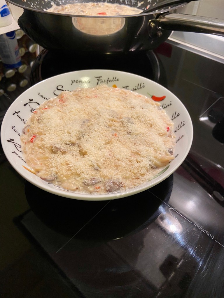 Când smântâna a îmbrățișat toate celelalte arome, adăugăm parmezanul.