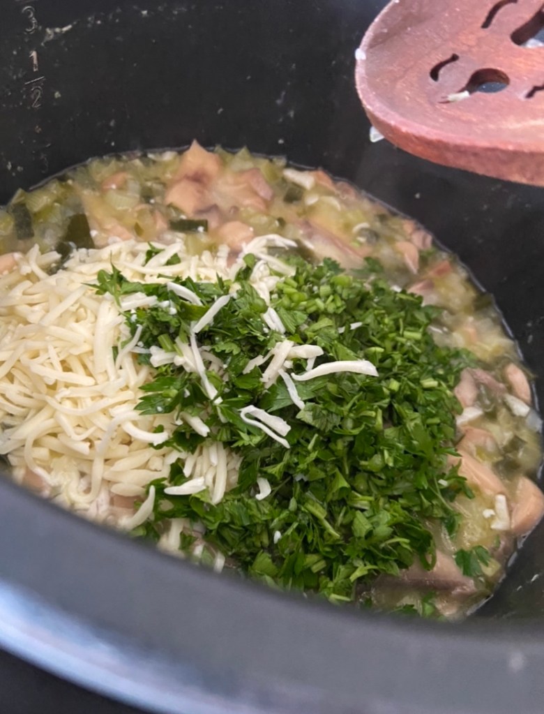 La finalul timpului de gătire, eliberăm presiunea și ridicăm capacul. Punem smântâna, brânza și pătrunjelul.