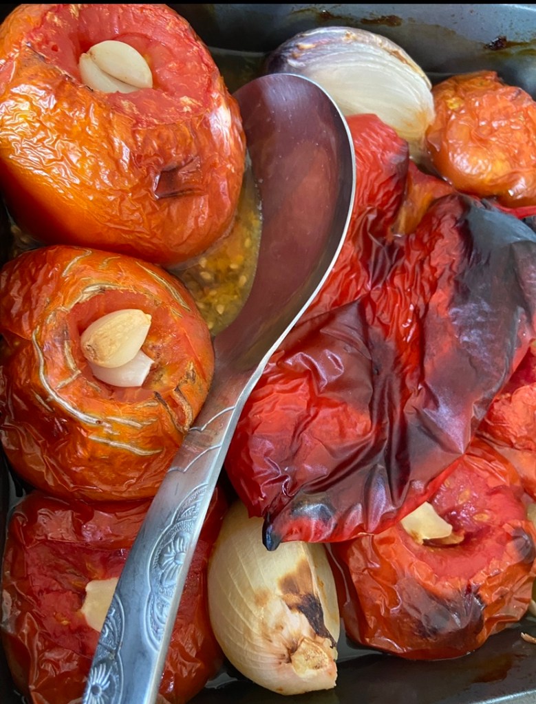 Tocăm roșiile și ardeiul kapia cuburi și le punem la final.