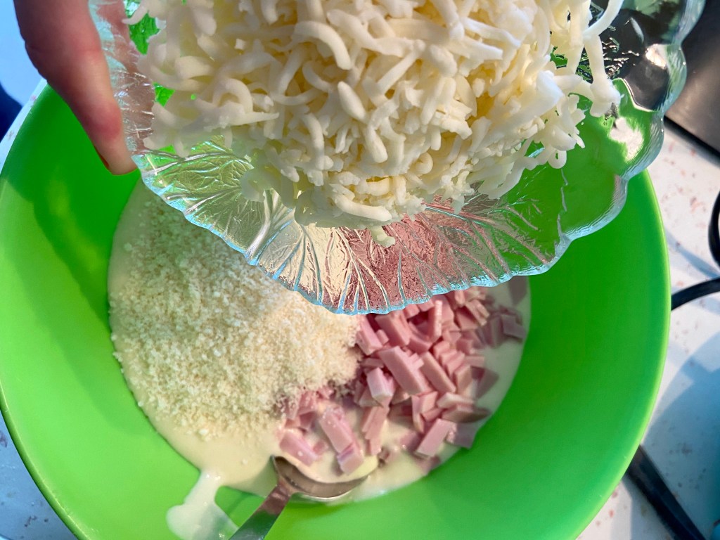 La final, eu am amestecat doar cu mozzarella, de început. După prima serie de vafe, am pus si restul legumelor.