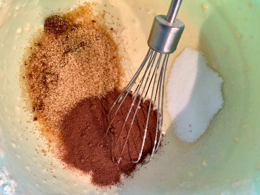 Punem într-un castron ouăle cu făina și cu laptele. Pornim mixerul pe viteză mare. Punem piureul și amestecăm un minute la viteză mică.